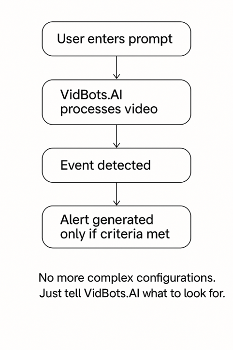 With VidBots.AI, there's no need to configure zones, install additional sensors, or deal with complicated rules. Users simply describe what they want to detect in plain language, and our system takes care of the rest. Whether you're watching for trespassers, identifying vehicles stopping in front of a building, or monitoring for loitering—VidBots.AI delivers high-accuracy alerts without the noise.